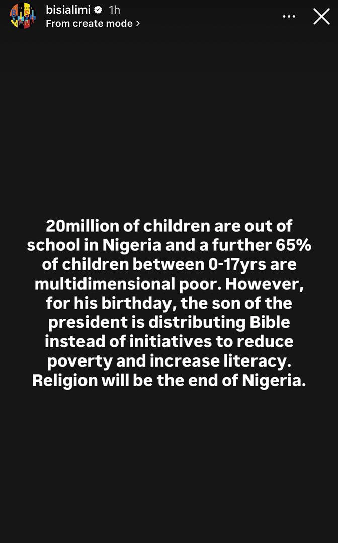 He wrote, “20million of children are out of school in Nigeria and a further 65% of children between 0-17yrs are multidimensional poor. However, for his birthday, the son of the president is distributing Bible instead of initiatives to reduce poverty and increase literacy. Religion will be the end of Nigeria.”